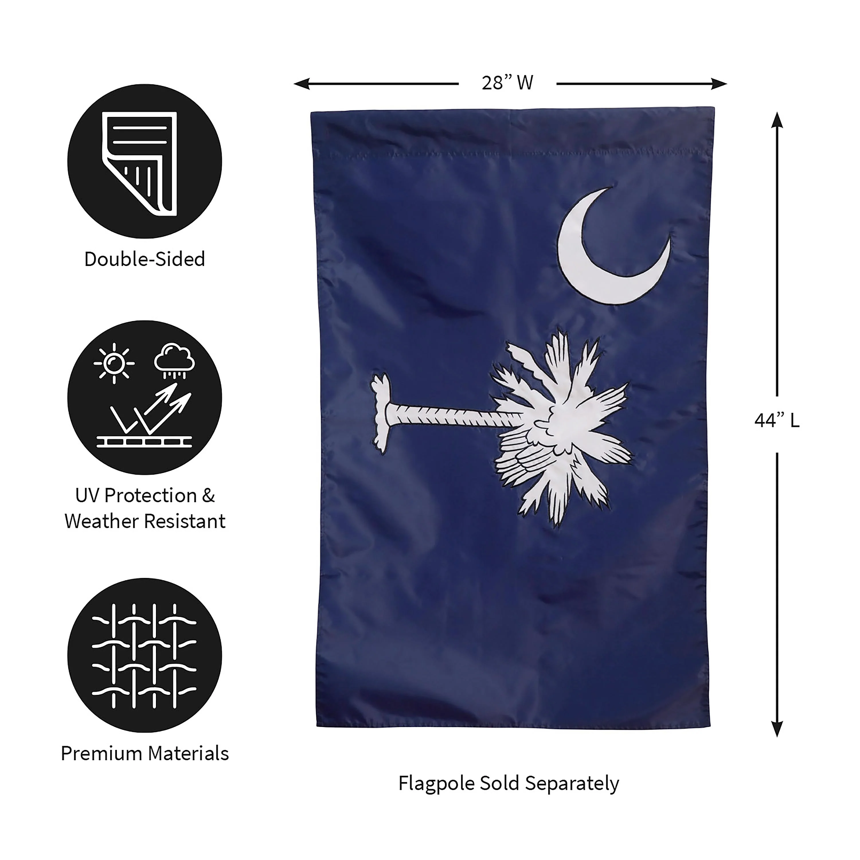 Show your pride for the state of South Carolina with this official state flag featuring the classic crescent moon and palm tree in complementing navy and white. This applique flag is made of durable 310 denier nylon to ensure the design will withstand all types of weather. The applique process combines pieces of fade resistant fabric with tight, detailed stitching to create a mosaic effect. The soft, yet heavy-weight material illuminates in the sunlight, making any of our applique flags a wonderful addition to your home or garden. All flags also feature an insertion sleeve at top for use with any standard flagpole or stand, sold separately.