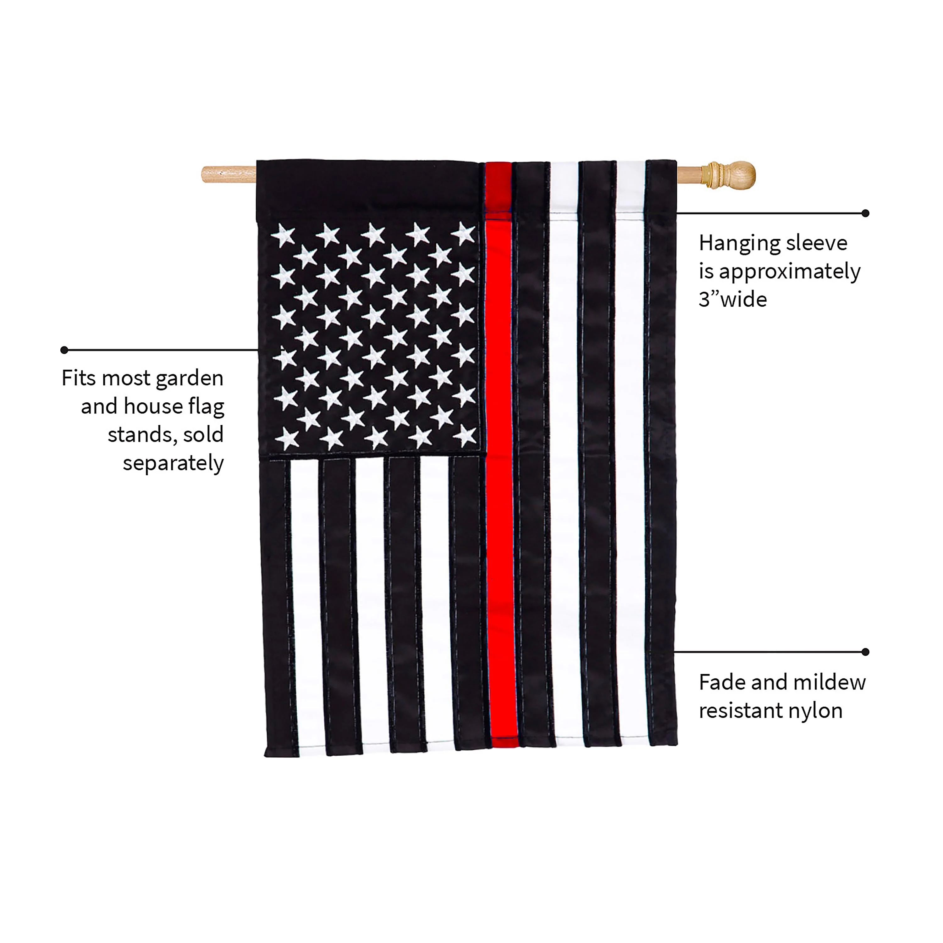 Greet guests in style with this Thin Red Line applique House Flag. Our appliqué flags were first introduced more than 20 years ago, and thanks to their bold designs and top-of-the-line materials they continue to be just as popular today. Each flag is made of strong 310 denier nylon to withstand all types of weather. We combine pieces of fade-resistant fabric with tight, detailed stitching to create a mosaic effect. The soft yet heavyweight material illuminates beautifully in sunlight.