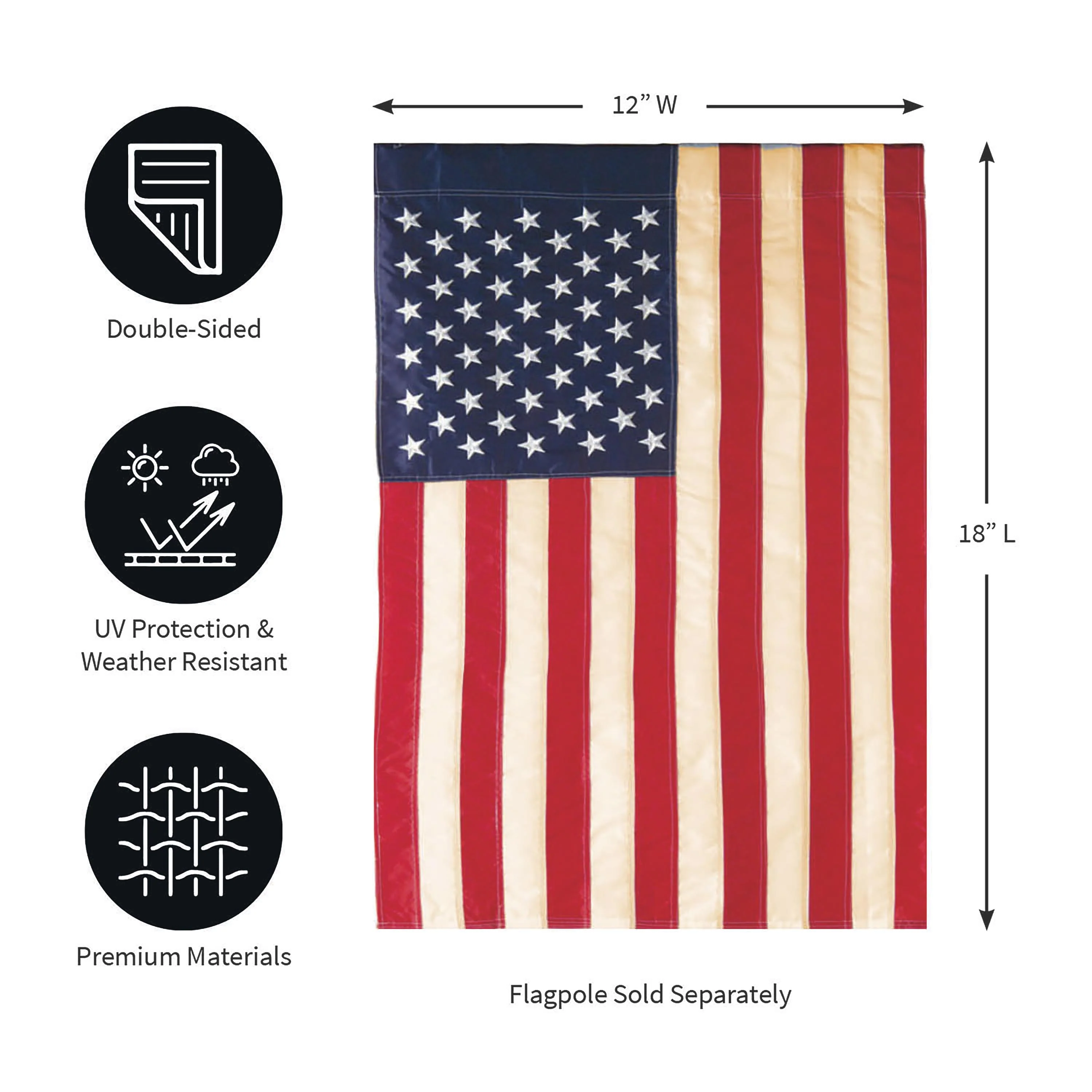 With thirteen red and white stripes and fifty stars standing out boldly upon their deep blue background, this American flag shows off patriotism and pride. The tea-stained finish adds a worn-in look that helps create a rustic feel. Old Glory can fly handsomely in the breeze on Memorial Day, the Fourth of July, and Veteran's Day, but why not fly these stars and stripes every day of the year? This applique flag is made of weather-resistant, 310 denier nylon to ensure the design will withstand all seasons. The applique process combines pieces of high-quality fabric with tight, detailed stitching to create a mosaic effect. The soft, yet heavy-weight material illuminates in the sunlight, making any of our applique flags a wonderful addition to your home or garden. All flags also feature an insertion sleeve at top for use with any standard flagpole or stand, sold separately.