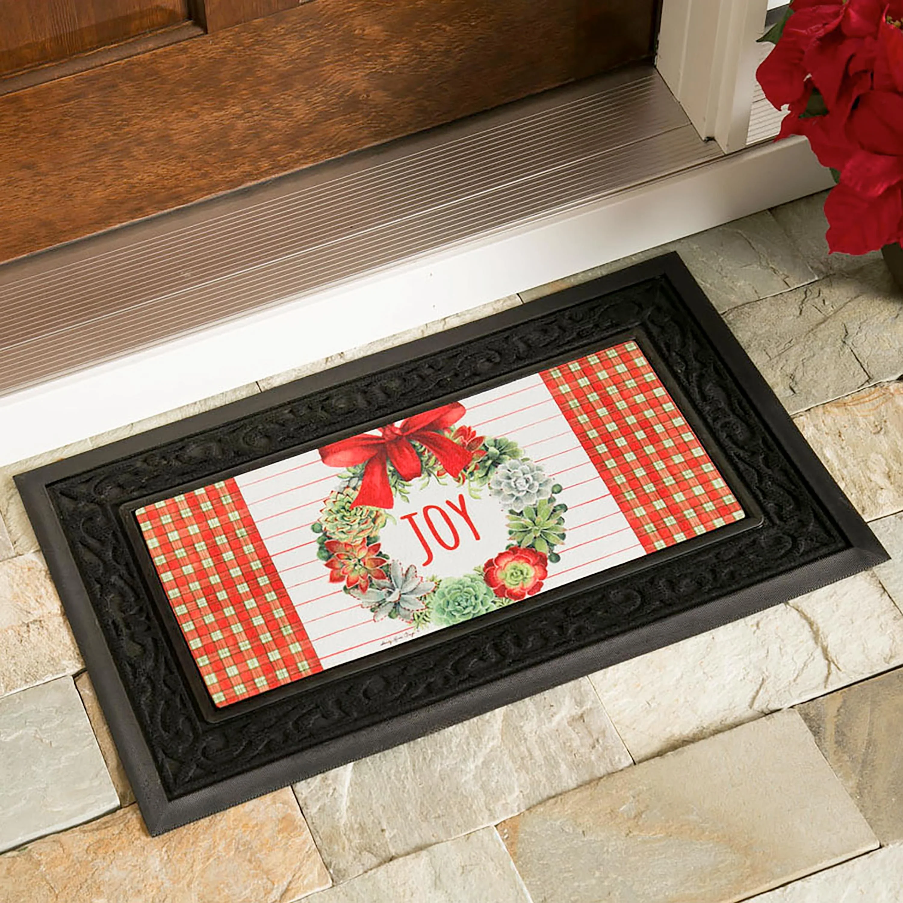 This top-selling decorative black mat tray is the perfect base for Evergreen's Sassafras switch mat inserts. With a textured felt scroll pattern, this tray features a 22 x 10 inch space to place your favorite interchangeable Sassafras mat designs. Made of recycled rubber with a skid-resistant backing, the classic black frame is mildew resistant, making it perfect for indoor or outdoor use. The diamond backing allows water to drain, ensuring your door mats last. Simply spot clean with soap and warm water when needed.